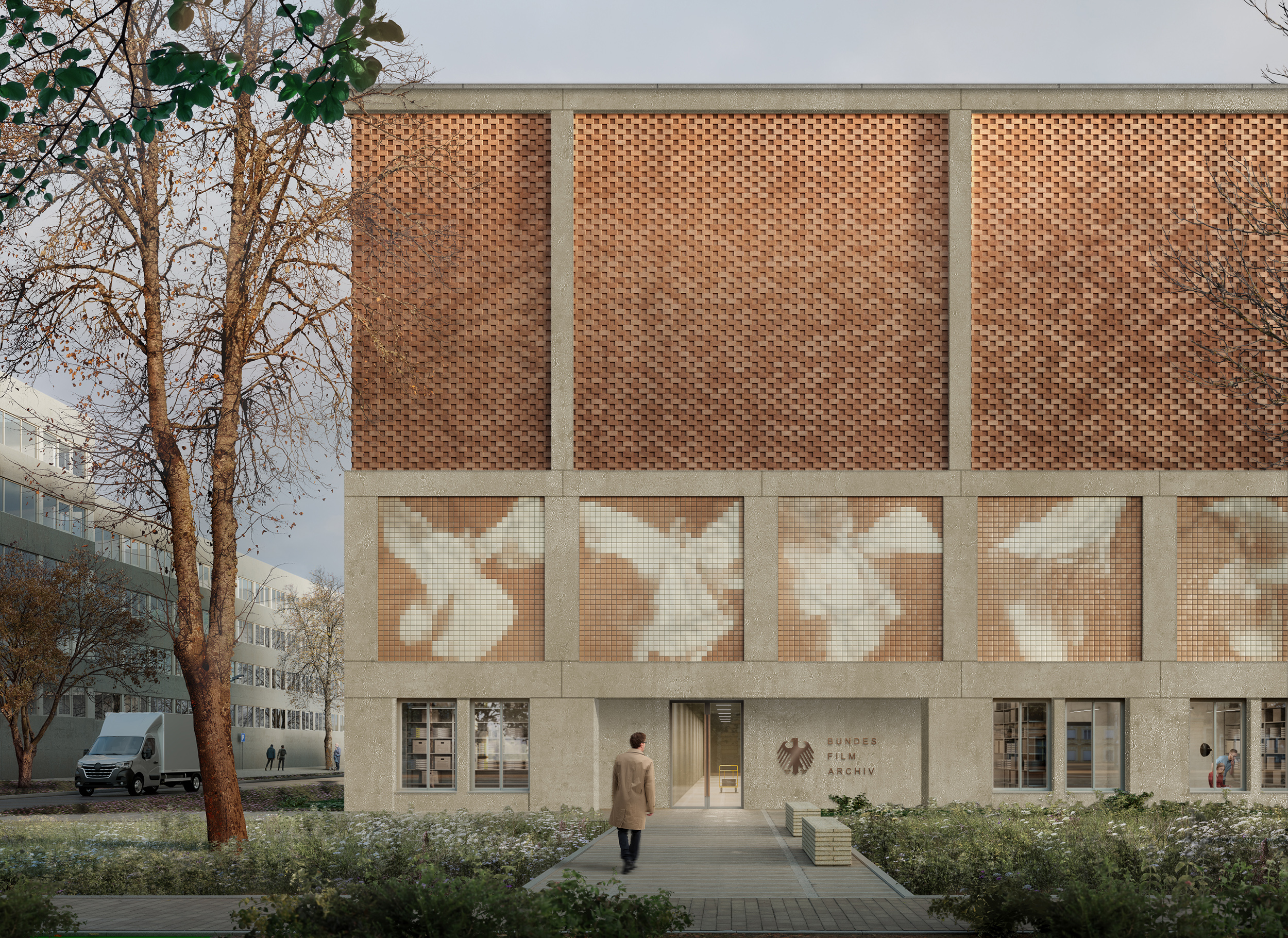 Um sie optimal lagern und erschließen zu können, wird in den kommenden Jahren ein Neubau am Standort Hoppegarten errichtet. Die Gliederung der in den Obergeschossen fensterlosen Fassade folgt einer Dreiteilung in Sockelzone, Mittelzone und Abschluss. Die mittlere Zone der Fassade soll mit einer filmischen Bildfolge bespielt werden. Es werden 48 Filmstills der sogenannten Serpentinentänzerin in abstrahierter Form wiedergeben. Es handelt sich dabei um Bilder einer simplen Frühform des Kinos, dem „Bioskop“ genannten Projektionsapparat der Berliner Filmpioniere Max und Emil Skladanowsky, die 1895 in Berlin öffentlich gezeigt wurden. Die Szenen der Tänzerin, abstrahiert in der Darstellung und eingebettet in die Materialität und Farbgebung der Fassade geben dem Gebäude ein unverwechselbares und dennoch unaufdringliches Äußeres. Die dauerhafte Verknüpfung des Themas Film mit dem neuen Bauwerk vermittelt subtil dessen Aufgabe als Archiv.